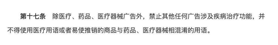 证实《中华东谈主民共和国告白法》第十七条文定,除医疗、药品、医疗器械告白外,退却其他任何告白触及疾病扶植功能,并不得使用医疗用语不祥易使倾销的商品与药品、医疗器械相污辱的用语 。