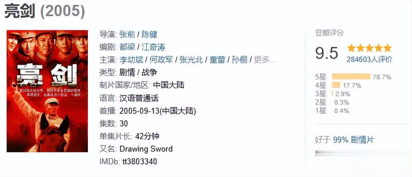 公开府上骄气,电视剧《亮剑》是由陈健、张前合手导,李幼斌、何政军、张光北等主演,王人梁、江奇涛担任编剧的干戈题材电视剧,于2005年9月12日在中央电视台轮廓频说念首播。如今在豆瓣网站上,跳动28万东说念主打分,评分高达9.5分。