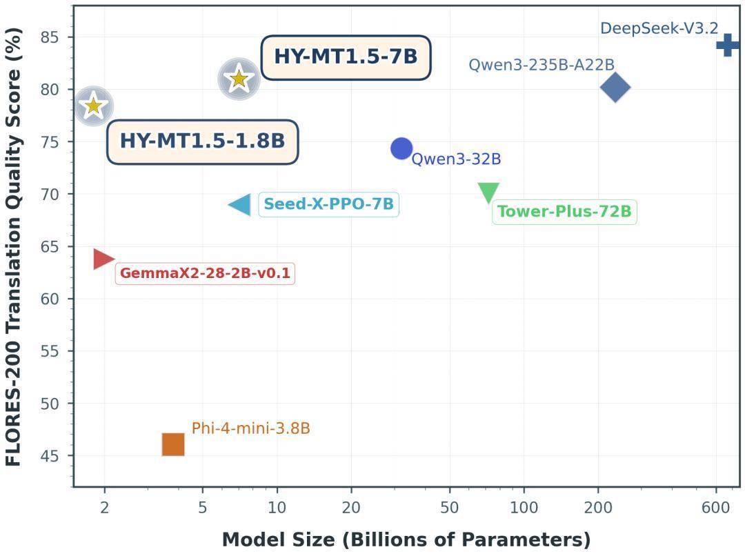 HY-MT1.5-1.8B 模子在 FLORES-200 质料评估中取得了约 78% 的分数,同期平均反馈时间 0.18 秒,超过主流商用翻译 API,适用于即时通信、智能客服、移动翻译欺诈等高详尽、及时翻译场景。