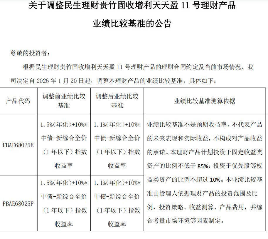 不外即使为指数型功绩比较基准,在商场情况、投资战略等发生变化时,答理公司也会退换功绩比较基准,比如民生答理1月份退换了“贵竹固收增利天天盈11号答理居品”的指数型功绩比较基准,下调了固定数值部分。