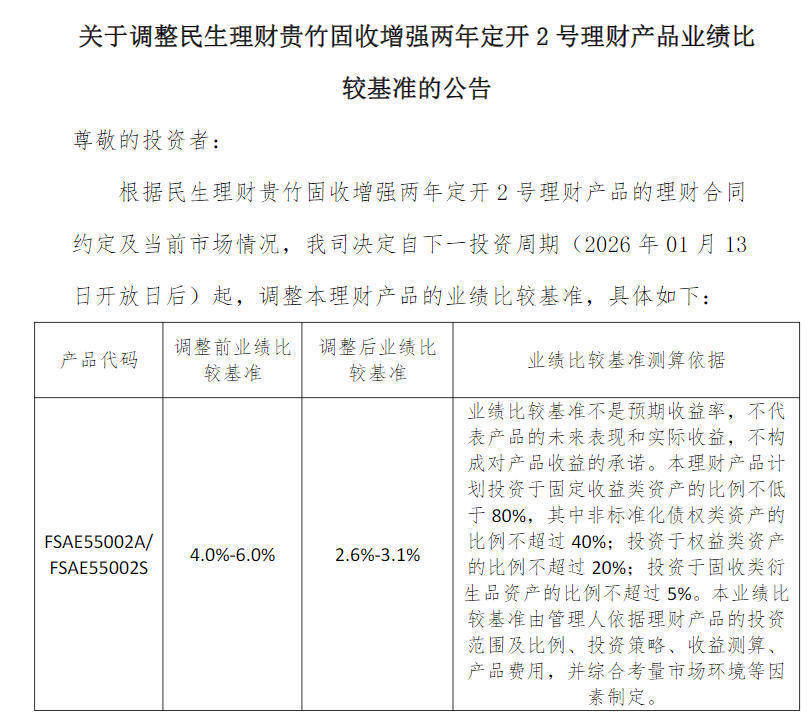 民生答理以致将部分居品功绩比较基准大幅下调,比如一款“贵竹固收增强两年定开2号”答理居品,退换前功绩比较基准为4%-6%,退换后降至2.6%-3.1%,功绩比较基准上限接近“腰斩”。下调原因为“凭证居品的协议商定及现时商场情况”。